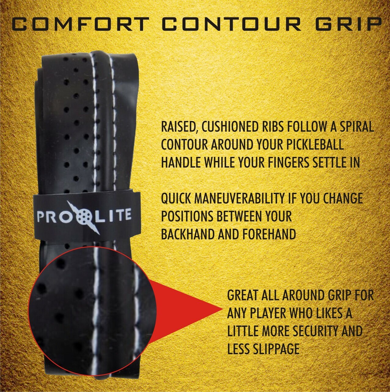 Prolite's Comfort Contour is a popular grip among the tennis to pickleball converts who find themselves looking for a more secure grip. It's raised, cushioned ribs are set deeper allowing your fingers to settle in nicely. If you change positions between your backhand and forehand, you can return to neutral quickly. A great all-around grip for any player looking for a little more security and less slippage.